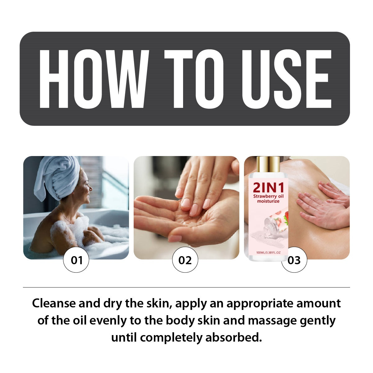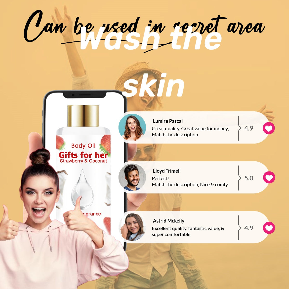 Our ladies massage oil contains strawberry extract, coconut extract and more. It keeps skin soft and improves skin texture. Improves the personal care experience. Perfectly integrates into everyday life. Improves your relationship with your partner. EASY TO USE: Cleanse sensual skin, keep it dry and massage gently until completely absorbed. Take an appropriate amount of the product and apply evenly to the sensual area. The product absorbs quickly and does not leave any greasy residue.
